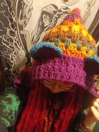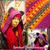 Our hoods are over sized so super comfortable and give such a comforting sensation of security. It's absolutely gorgeous and soft in texture and features two funky purple and teal trimmed ears with two braids in the front.